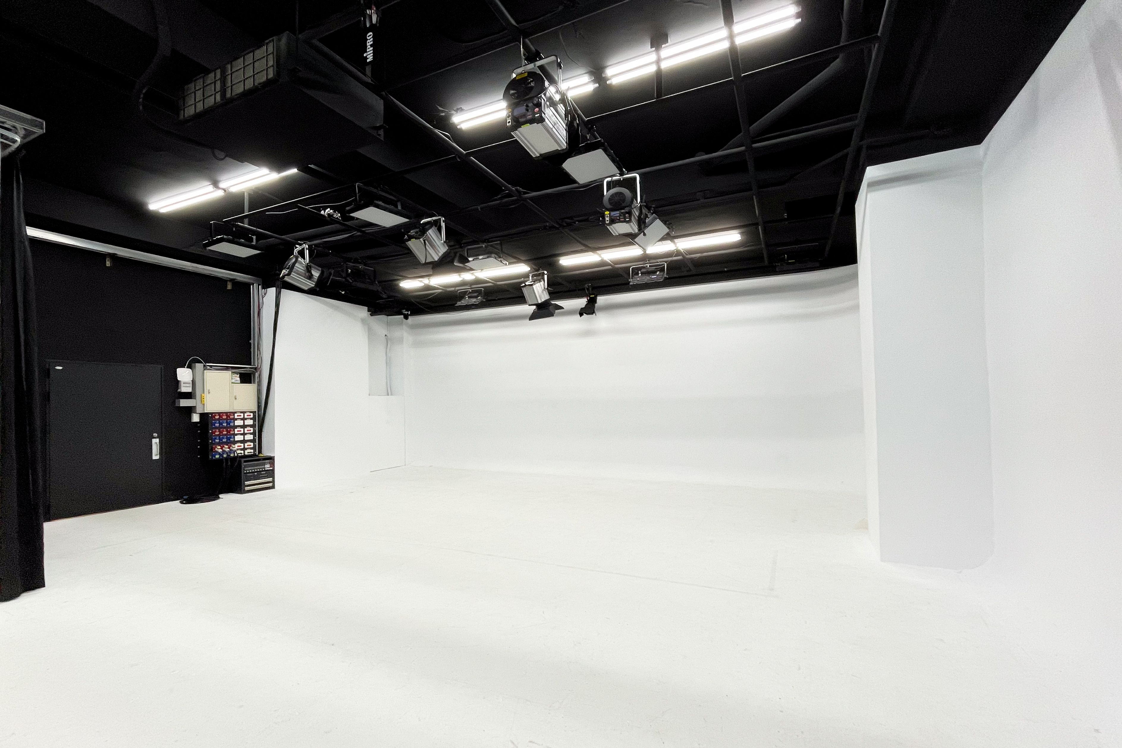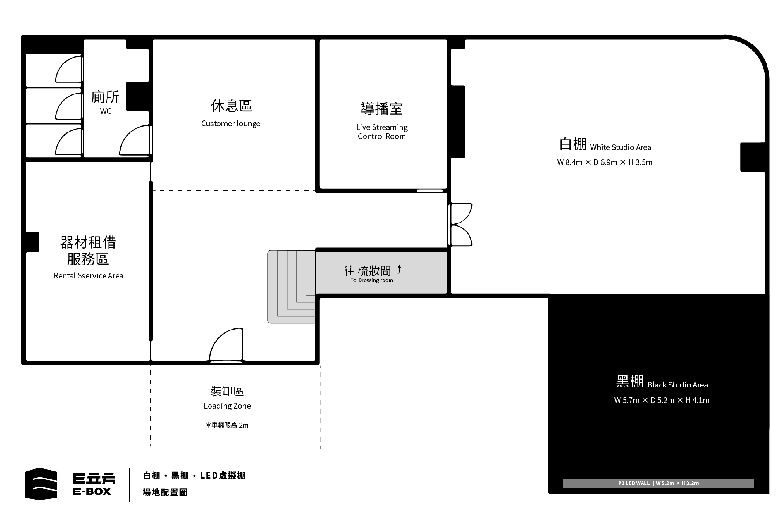 【黑白無縫棚方案】 ・$4,000 / 4hr,超時$1,000 / hr ・電費每度5元計(獨立電錶計算) ・使用棚型:白棚、黑棚(不含LED) 【P2 LED虛擬棚方案】 ・$3,500 / hr,依租借時數計費。 ・電費每度5元計(獨立電錶計算) ・使用棚型:LED+黑棚、白棚 【直播、拍攝、套裝服務】 ・請直接聯繫官方LINE,依需求報價。 【注意事項】 ・攝影棚為複合式空間,請選擇合適的方案租借,方案不可混搭。 ・拍攝單位請來場勘,確認場地符合您的需求,並完成定金付款才會保留檔期喔! ・每次租借攝影棚,場地交付時會提供定型化契約,完成簽署,方可使用。如因人為操作不當,造成場地或器材損毀,須依約賠償。 ・場地維護人人有責,垃圾須妥善分類,場地交付時,垃圾若無分類、環境髒亂,則加收清潔費$5000元。 E立方|複合式影像創作空間,專為小規模影視工作者打造各種專業的影像工作空間。空間多元,提供動態影像拍攝或者影音節目製播,另有附設直播副控室。 空間介紹,詳見場地配置圖及以下說明: 【 P2 LED虛擬棚 】 ・場地尺寸 W:5m D:5m H:4m ・LED尺寸 W:5m H3.2m ・可自備素材投放 ・背景置換,輕鬆不費力 【 黑白無縫棚 】 ・W:8m D:12m H:4m ・位於內湖區康寧路三段,鄰近葫洲捷運站,步行約三分鐘 ・設有獨立梳化間、客戶休憩區 ・攝影棚位於B1,車輛可達(限高2m),方便進出 ・收音不受外界干擾 ・電力 220V 180A / 110V 60A ・設有器材庫房(須租借),棚內已有基本燈光約15盞(加購價$1,000),輕鬆拍攝不費力 ・設有直播專用線路(須付費),穩定可靠不斷線 ・6×6m 綠KEY布免費提供,可付費指定牆漆改色,歡迎洽詢! 【 直播副控室 】 ・採用先進製作流程,遠端製作不受距離受限。 ・配有廣播級導播機、OLED監看電視、數位混音器、多平台直播編碼器、字幕機、回放系統…等等。