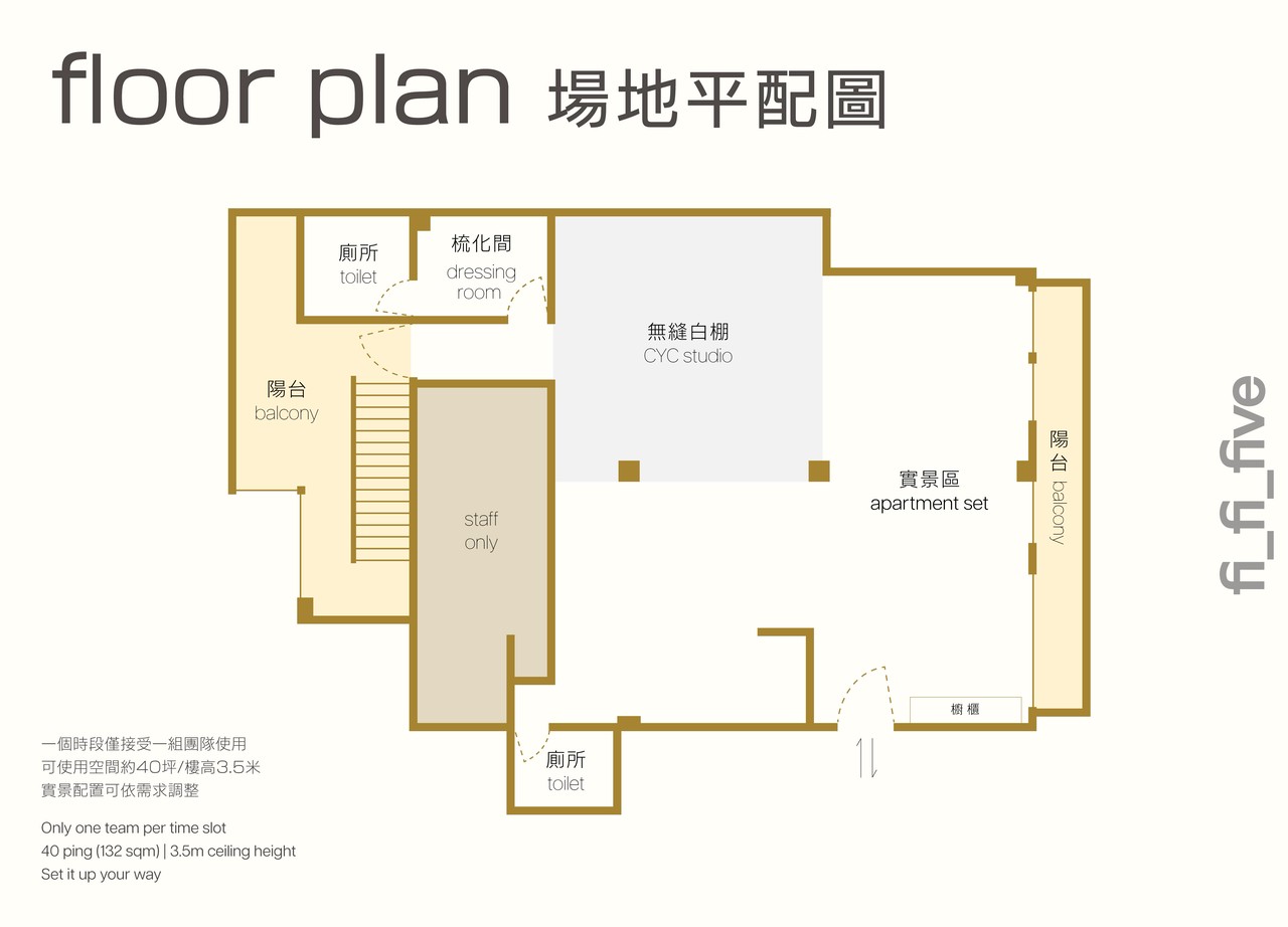 [白棚] 平面拍攝:NT$1,200/hr 動態拍攝:NT$1,500/hr [實景棚] 平面拍攝:NT$1,800/hr 動態拍攝:NT$2,100/hr [全區] 平面拍攝:NT$2,500/hr 動態拍攝:NT$2,800/hr - 單次租借滿4hr即可享9折優惠 - 最少租借時數為2小時,全日租借時段為10:00-18:00(時間可往前或往後調整) - 晚上22:00至早上07:00為夜間加成時段,租借費用以原場租費用加上超時$300/小時計 - 為維護拍攝品質,一個時段只接受一組團隊預約,若拍攝容納人數超過8人每多1人收150元/小時,超過12人以包全區計算,最多建議容納20人 - 以上費用均為末稅價,發票開立稅金另計 - 有活動租借或長期租租用需求,請洽工作人員