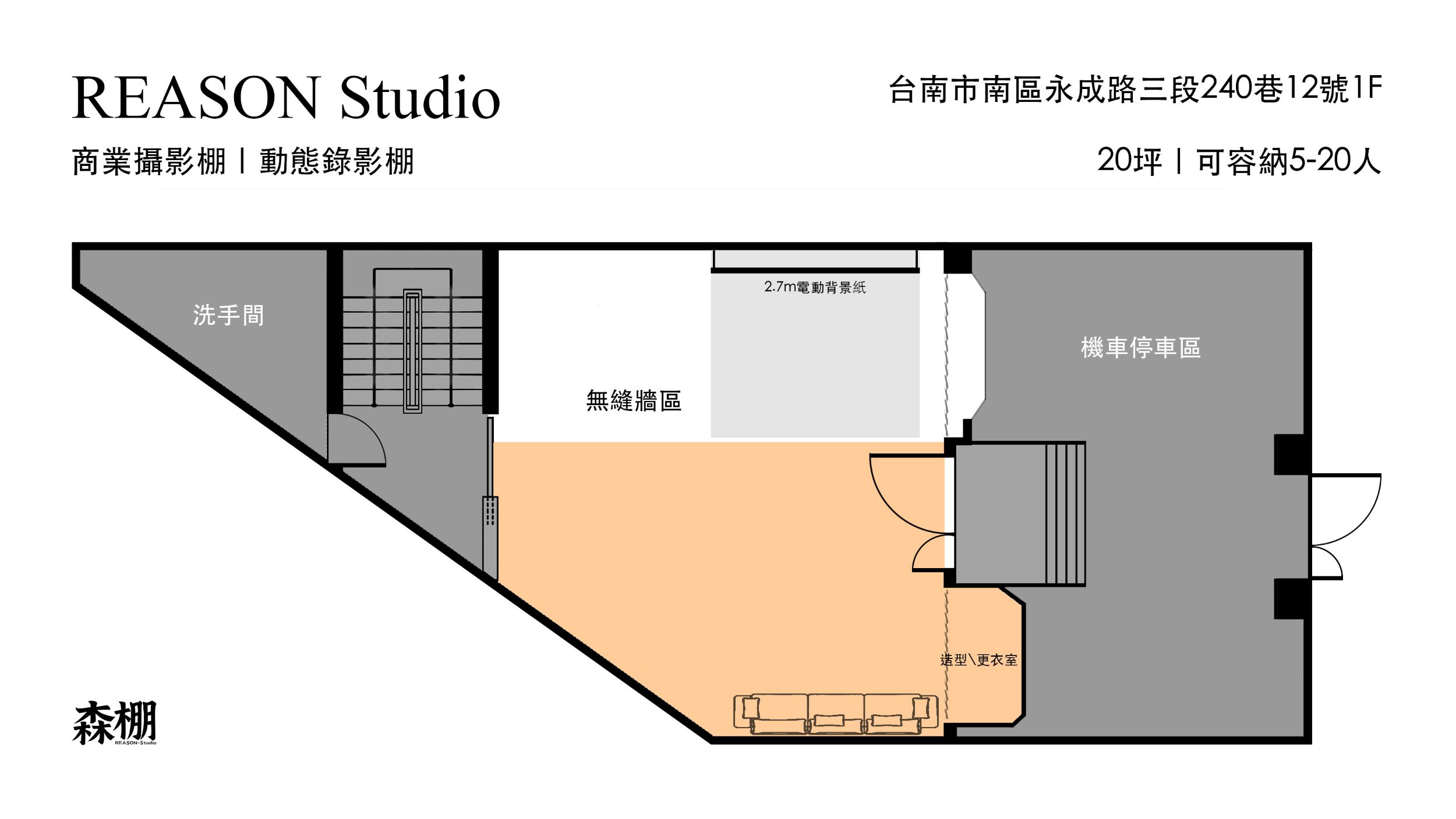 NT$ 500/小時,四小時打卡享優惠NT$ 1800。 另有夜間(21:00-06:00)租棚特惠,NT$ 400/小時。 平日租借2小時起,平日晚間或假日3小時起) 攝影棚簡介: 森棚為瑞森影像在台南設立的複合式專業攝影棚,提供動態、平面拍攝及節目製播使用,特色為六米寬的無縫牆素白背景,方便拍攝各類商品及人像。 除了場地租借外,我們也有提供攝影器材租借,可以滿足您的任何影像需求! 攝影棚位於一樓,門口和附近好停車。 攝影棚設備 白棚具有多色背景紙、大型無縫白牆。 免費提供:柔光罩、八角罩、雷達罩、蜂巢罩、長條罩、C-Stand、大小旗板、反光板。 攝影棚門口附有平面停車位,如需預留多位,請提早告知。 商業攝影 如需攝影師拍攝服務,請洽詢小幫手。 攝影棚提供器材租借,詳情點擊連結:https://reurl.cc/W352Qe 相關費用: NT$ 500/小時,四小時打卡享優惠NT$ 1800。 另有夜間(21:00-06:00)租棚特惠,NT$ 400/小時。 平日租借2小時起,平日晚間或假日3小時起) 6米寬白棚,多色背景紙、專業棚燈及控光幕設備齊全。 平面開放空間一次一組,大量商品也放得下。 適合網拍、創作、平面動態廣告、產品拍攝。 (以上方案租借皆包含造型間使用) 每組限定6人,第7人開始酌收 NT $100元清潔費 ※現場臨時延長租時數需視後續預約狀況為主,若要續租請先詢問現場人員確認※